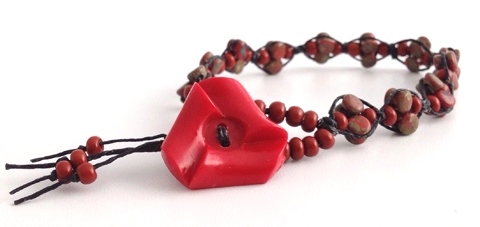 I also used their ability to butt closely with other round beads in the next design - a wrapped cord and button bracelet. Most people use the same size bead all the way around. I had fun making a much more relaxed version.