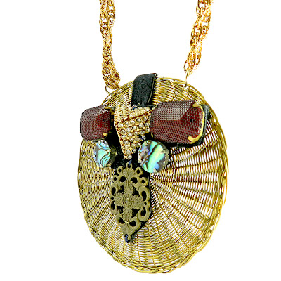 such as the necklace below. The round disc was created by meticulously weaving brass wire rather like for basket work. The other individual elements are then woven in afterwards.
