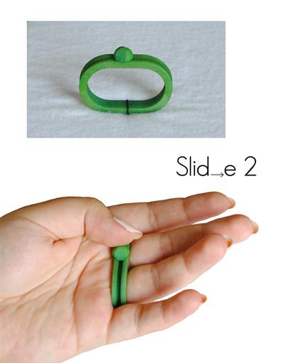 The Slide 1 is the simplest of her designs. The rings are made such that the slider can be moved along the whole channel or just to and fro. I had no trouble selecting my size using one of my own rings and her ring sizing chart (in the
