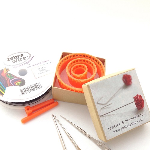 The kit includes wire spools, 0.6 mm crochet hook, DVD tutorial, gold filled or sterling silver ear wires and the tool to make the earrings.