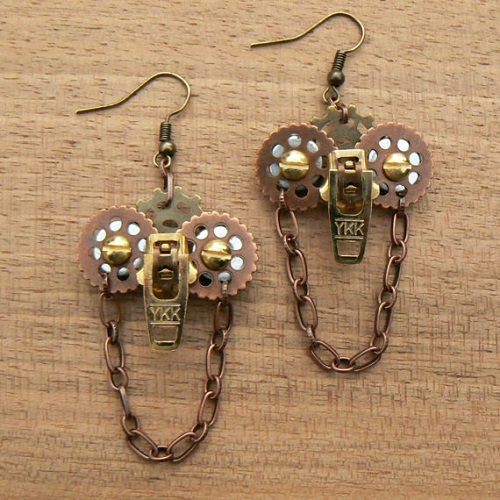 They cleverly integrate zippers with other components like chains and brass stamping to create unique insect or animal designs. Shown here are a selection of some of my favorites including the steampunk owl earrings!