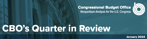 Over the past three months, CBO has produced a variety of budget and economic analyses, fulfilling the agency's core mission of supporting the Congress during each stage of the legislative process. CBO published various cost estimates and analytic products (mostly reports and working papers). This newsletter is a companion to CBO's Recent Publications and Work in Progress as of December 31, 2023, which offers a summary of both recent publications and those scheduled to be released in the coming months. CBO also regularly publishes presentations and data, which can be found on the agency's website. |