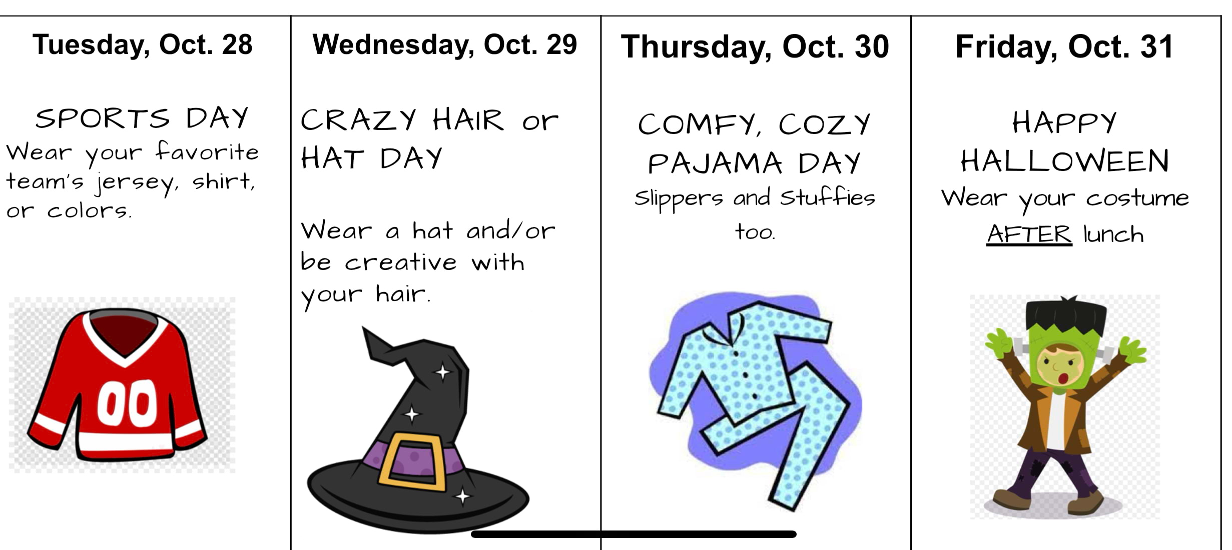 Student Council Spirit Week Continues!Tuesday: Sports Day Wednesday: Crazy Hair or Hat Day Thursday: Pajama Day Friday: Halloween! Change into costumes after lunch. | |